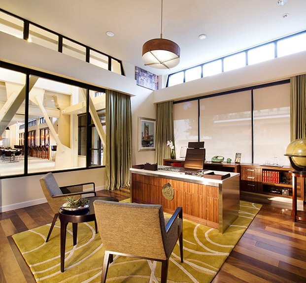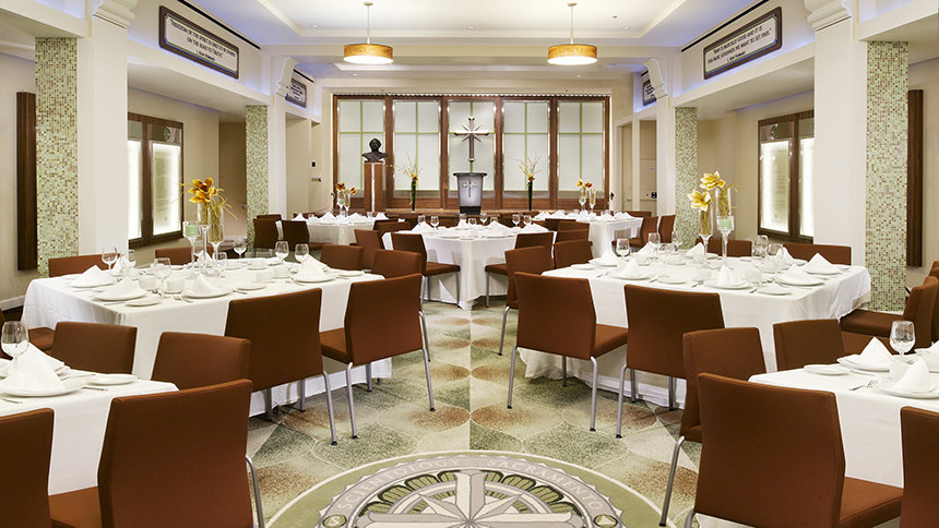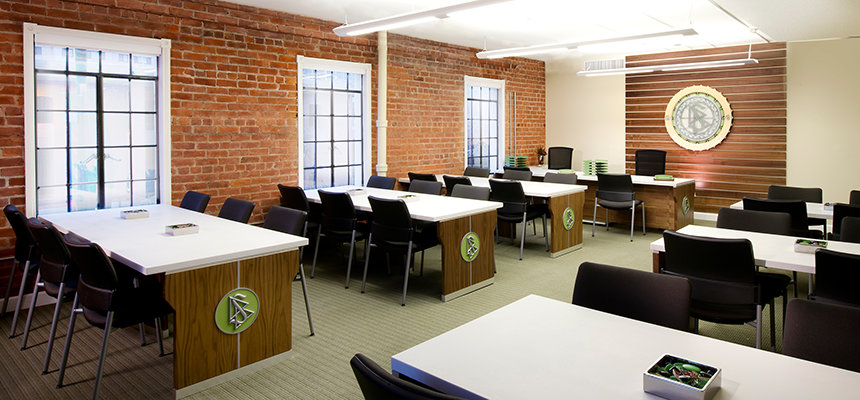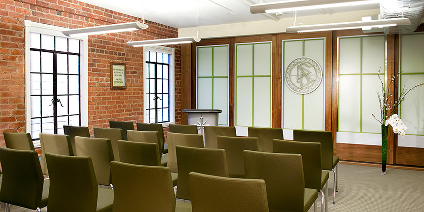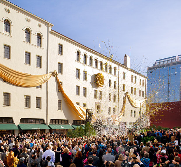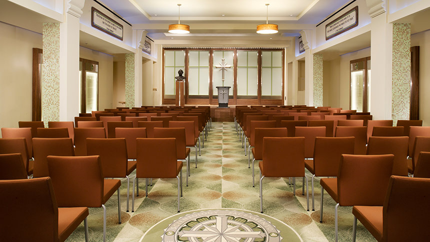 Het nieuwe gebouw van de Kerk ligt dichtbij de zetel van de Staat en is een prachtig monumentaal pand. Het gebouw werd oorspronkelijk geopend in 1930 als het Ramona Hotel. Het is ontworpen door de eerste architect van de staat Californië en een typisch voorbeeld van de zogenaamde Spanish Colonial Revival style. De kerk heeft er zorg voor gedragen de structuur van het gebouw te bewaren en haar weer in haar volle glorie te renoveren, waaronder het karakteristieke pleisterwerk, glazen stenen, terra cotta tegels, ijzerwerk ter decoratie en het oorspronkelijke uithangbord. De gehele renovatie is gedaan volgens de normen van het Gouden Standaard Certificaat van het U.S. Green Building Council's Leadership in Energy and Environmental (LEED), wat betekent dat de verbouwing zo min mogelijk negatieve invloed heeft gehad op het milieu en zo duurzaam mogelijk is geweest.