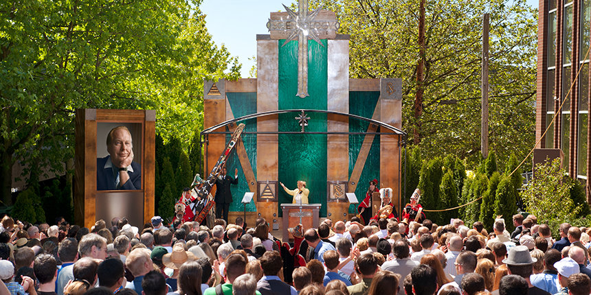 David Miscavige, Voorzitter van de Raad van het Religious Technology Center en kerkelijk leider van de Scientology religie, hield de openingstoespraak, en bedankte de scientologen die als speerpunt voor de bouw van de nieuwe Kerk fungeerden.