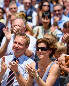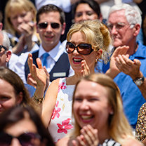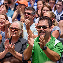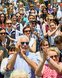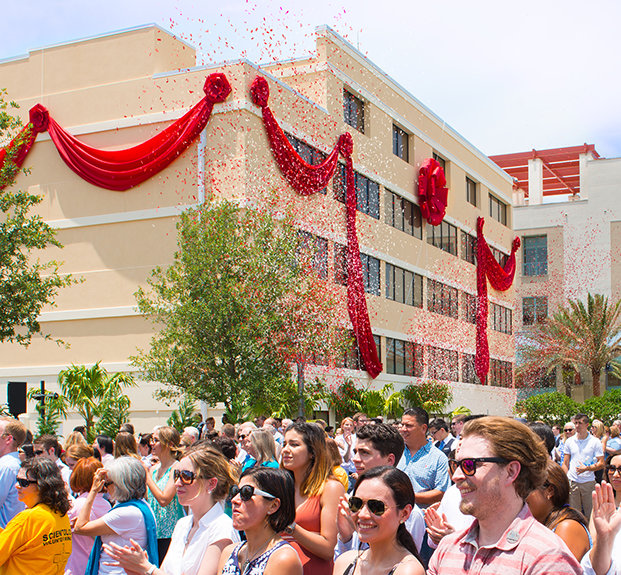 De enorme menigte dromde bijeen terwijl er twee linten tegelijk werden geknipt voor de feestelijke opening van de West Coast Building (WB) en de Flag Crew Administration Building, voorheen bekend als het Lee Arnold Building.