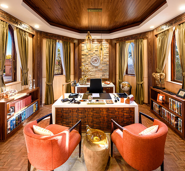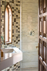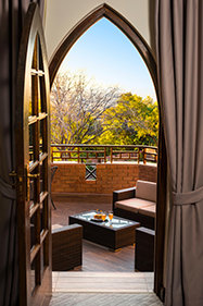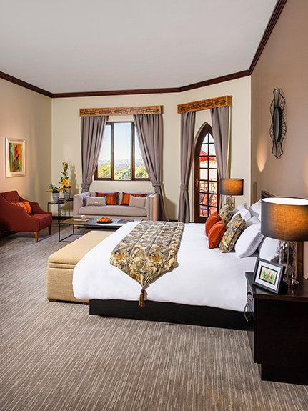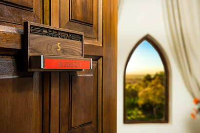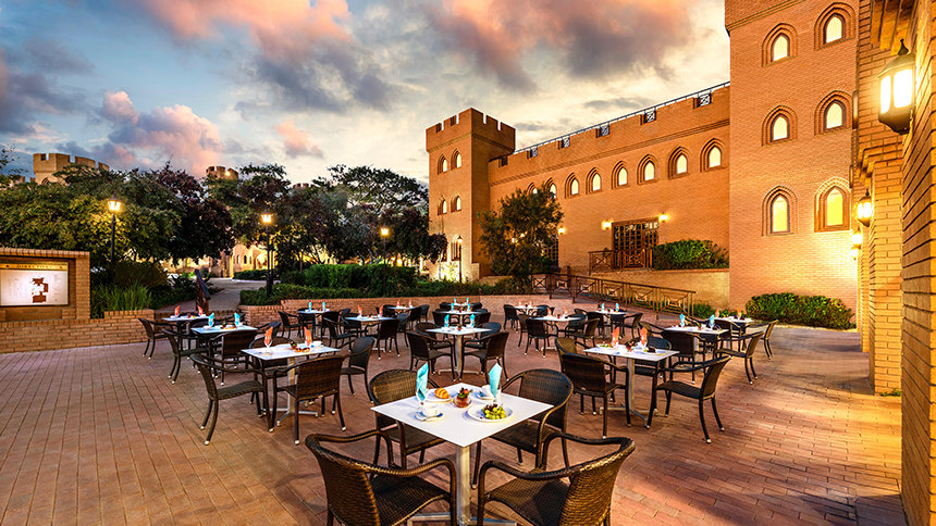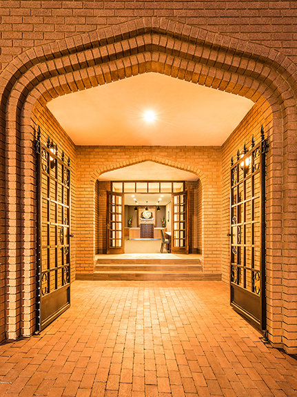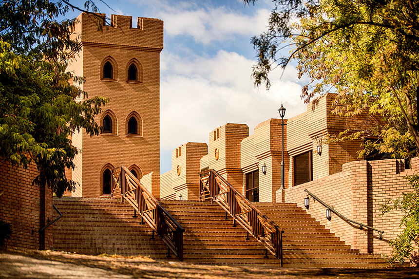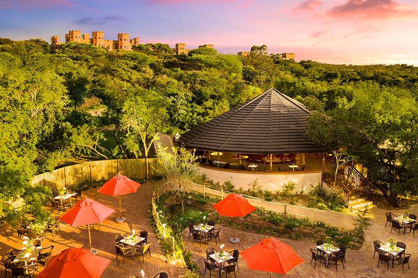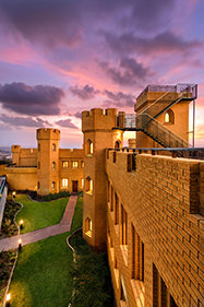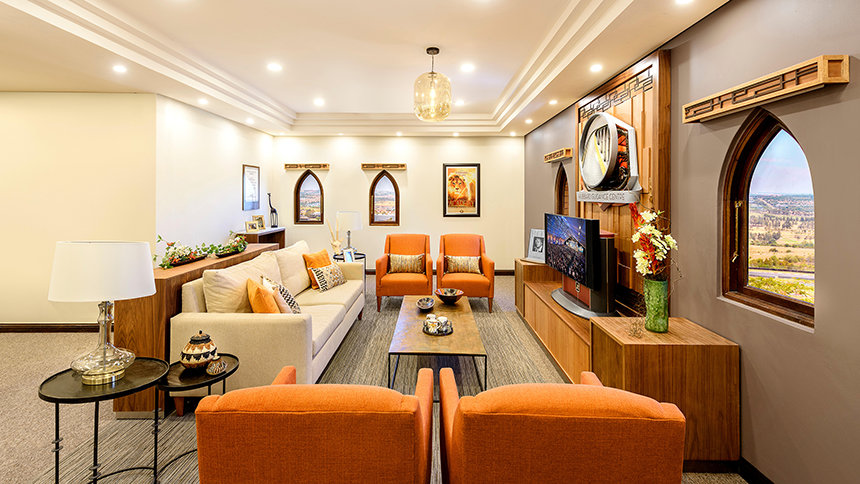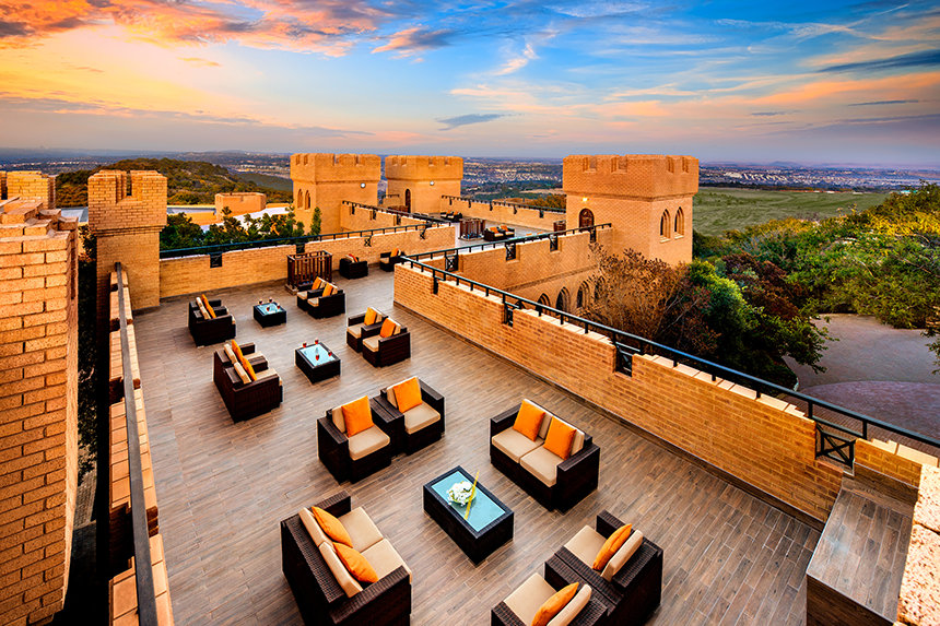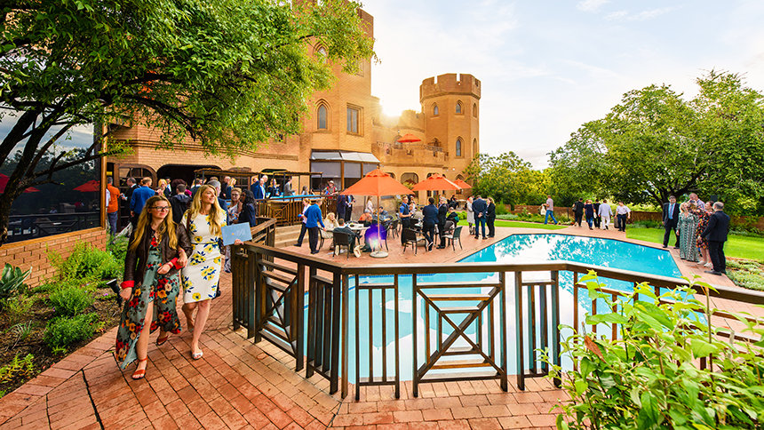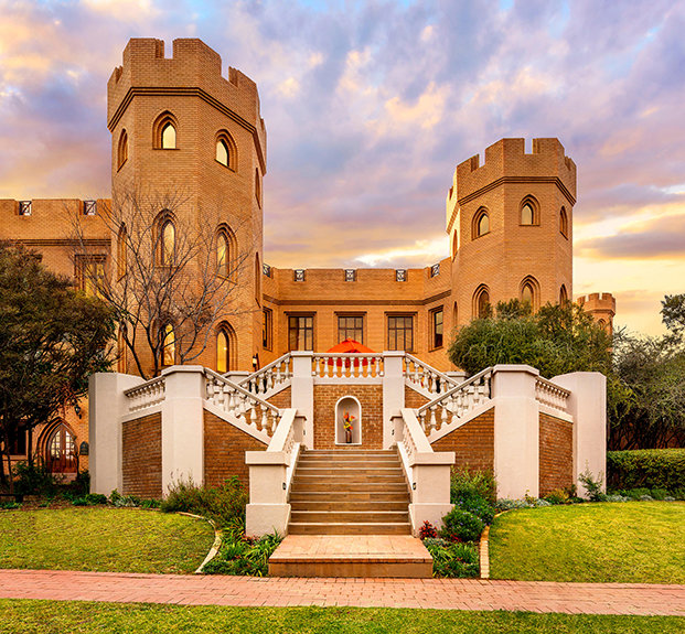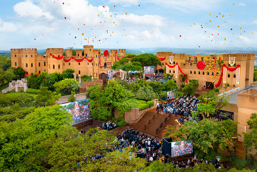 In het midden van die prachtige heuveltop, op 22 hectare grond, staat het 8000 vierkante meter grote Castle Kyalami als blijk van de betrokkenheid van de religie om te helpen een Afrika te creëren dat zijn onbeperkte potentieel kan vervullen. De aanwezigheid van het kasteel weerspiegelt de magische aura van het Zuid-Afrikaanse landschap, waar men kan uitkijken in de richting van de tweelingreuzen in Gauteng – Johannesburg in het zuiden en Pretoria in het noorden. Het panoramische uitzicht bekoort al snel bezoekers, en het kasteel met de 12 gekanteelde torens en de 20 centimeter dikke muren geven een unieke ambiance. De elegantie van het interieur wordt versterkt door de Italiaanse marmeren vloeren, uit dezelfde steengroeven die door Michelangelo werden gebruikt, wat zijn eigen speciale sfeer bijdraagt aan de spectaculaire grootse opening.
