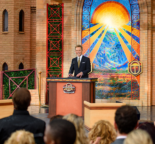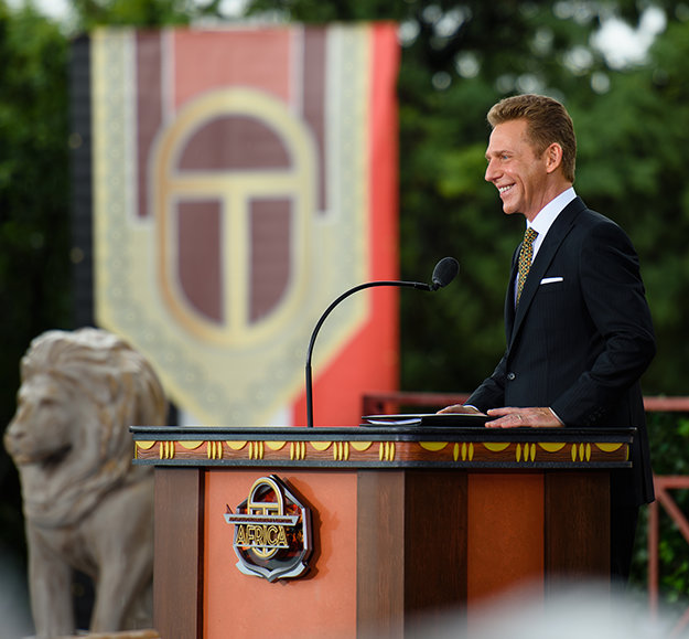 Op Nieuwjaarsdag, met een adembenemend uitzicht vóór hem, en de opvallende vorm van Castle Kyalami achter hem, stond dhr. David Miscavige, kerkelijk leider van de Scientology religie, voor de duizenden mensen die zich daar hadden verzameld, en sprak over de gedenkwaardige aard van deze unieke grootse opening.