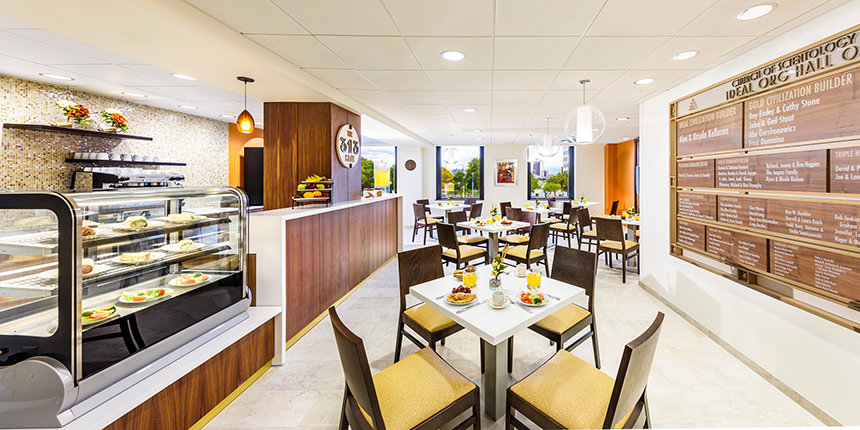 Het Café biedt een ontmoetingsplaats voor degenen die evenementen bijwonen maar ook voor parochianen tijdens pauzes van hun Scientology diensten.