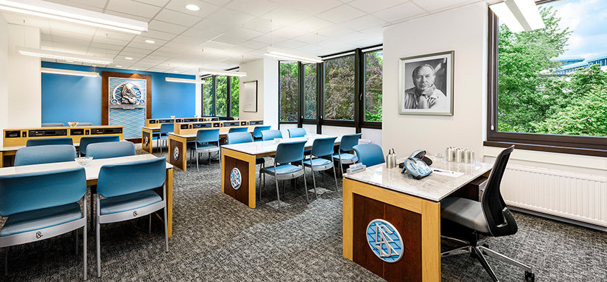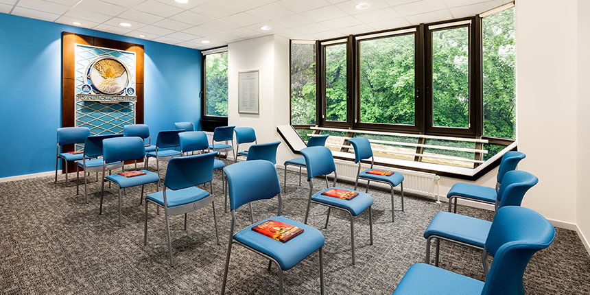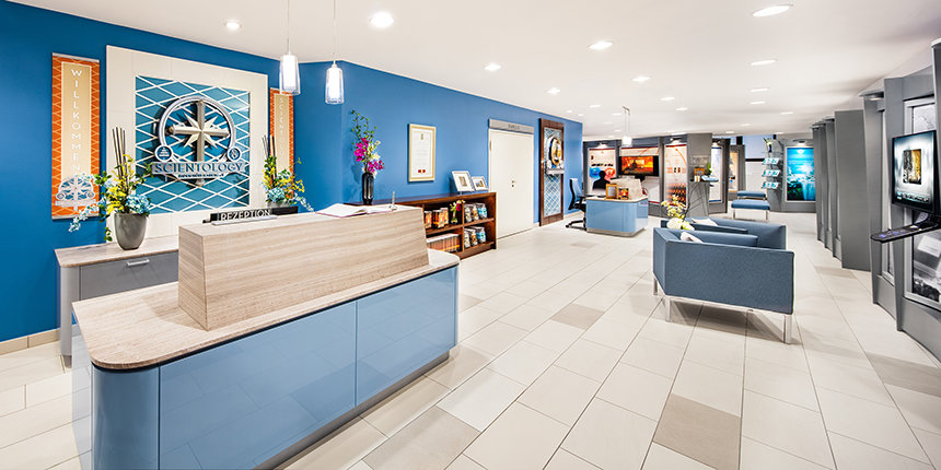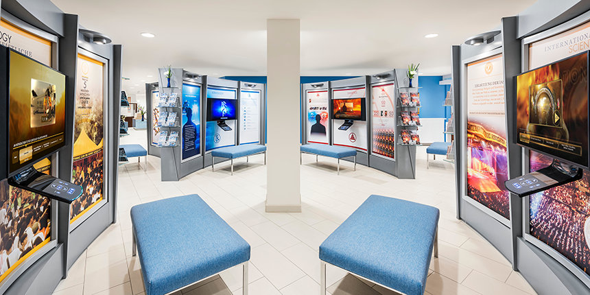 Terwijl bezoekers Stuttgarts nieuwe Scientology Kerk binnengaan zijn ze getroffen door een palet van staal blauw, chroom en grijstinten die de hightech identiteit van de stad weerspiegelen. De bleke accenten van het gebouw, gemengd met het mahoniehout, geven een rustig, gastvrij aspect aan het Informatiecentrum waar een introductie tot Dianetics en Scientology wordt gepresenteerd. Displays met meer dan 500 films in 17 talen laten de fundamentele geloofsovertuigingen en praktijken van de Scientology religie zien, alsmede het leven en de nalatenschap van grondlegger L. Ron Hubbard.