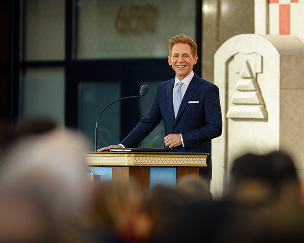 Chairman of the Board Religious Technology Center, meneer David Miscavige, verwelkomde de opgetogen menigte voordat het lint werd doorgeknipt. “Vandaag doet deze Second City werkelijk voor niets onder”, zei meneer Miscavige. “En voordat het lint van de Windy City naar beneden valt, is dit ook het moment om te zien wat je al weet: dat, net zoals Chicago ooit na de grote brand herboren werd, er vandaag ook ruimte is voor een nieuw begin. En dus ruimte voor het herstellen van het vermogen van mensen om een beter leven te leiden – in hun eigen ogen en met hun medemens en het spelen van een beter spel.”