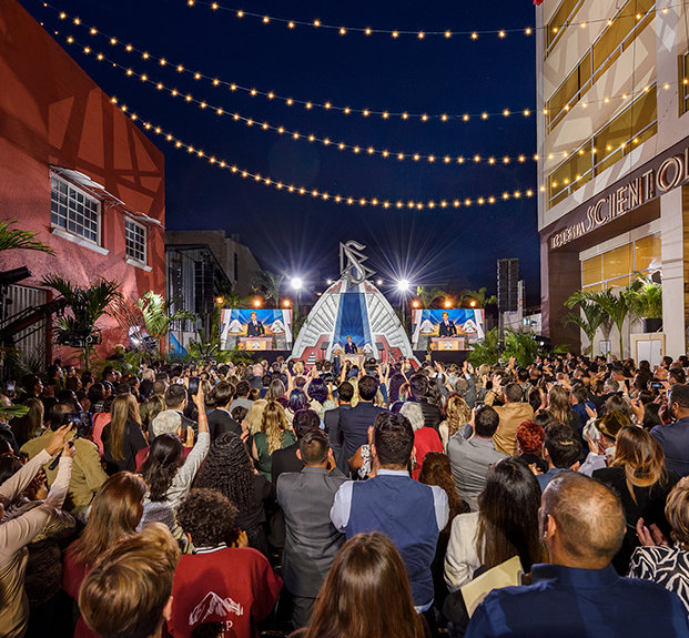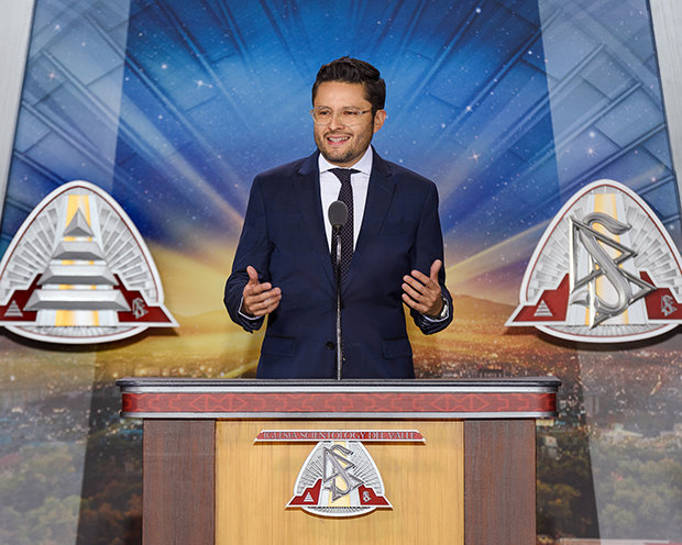 Dat enthousiaste welkom werd duidelijk toen meneer David Miscavige, kerkelijk leider van de Scientology religie, het podium opkwam om alle aanwezigen toe te spreken. “Vergeet niet, de essentie en levenskracht van een Ideale Org is precies wat onze Grondlegger voor ogen had: ‘Een activiteit waar mensen naartoe zouden komen om vrijheid te verwerven en waar ze het vertrouwen zouden hebben dat ze die vrijheid ook zouden bereiken.’ En dat gaan we vandaag vieren. Het is het geschenk dat jullie aanbieden. En de visie die is uitgekomen door jullie, de helden van deze beweging, bij het creëren van deze Ideale Org”, zei meneer Miscavige. “Wil je zien hoe er geschiedenis wordt geschreven in deze Latijns-Amerikaanse megastad? Wel, het moment is aangebroken – hier en nu.”