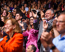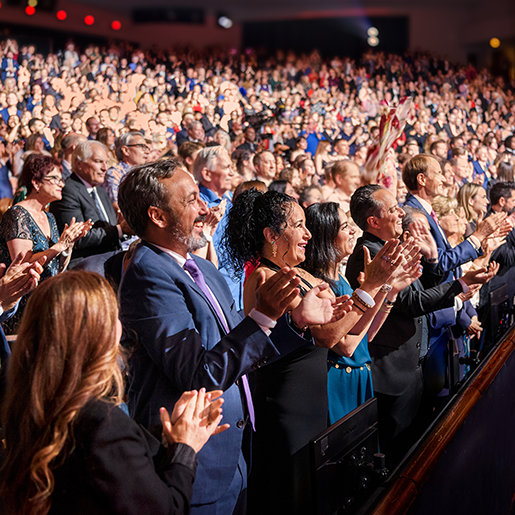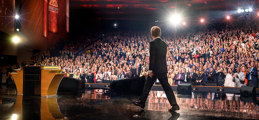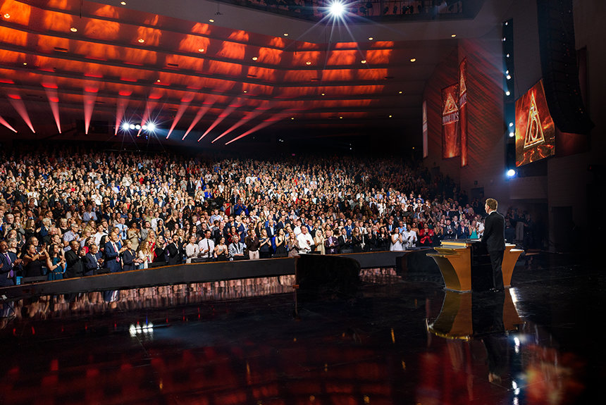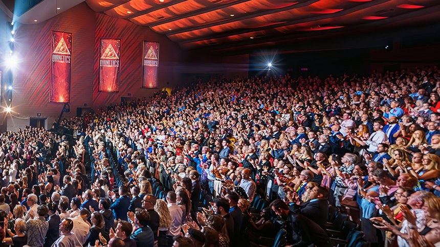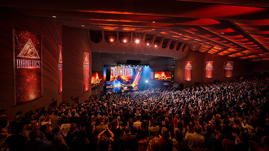 Het publiek barstte uit in een lange, spontane staande ovatie toen meneer David Miscavige, de kerkelijk leider van de Scientology religie, verscheen. “Precies 75 jaar geleden ontketende een boek genaamd Dianetics een seismische kracht die de wereld deed schudden”, begon hij. “En in de viering vanavond doen we niets minder dan de sterkste kracht op aarde eren, een kracht voor geestelijke gezondheid en voortbestaan.
