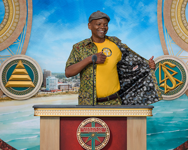 Prins Sonwabile Ndamase zorgde voor enthousiasme onder het publiek terwijl hij sprak over de spirit van hulp belichaamd in de Scientology Volunteer Ministers van de Kerk. “Mijn eigen verhaal met jullie begint met ‘een flits van geel’. Halverwege de pandemie kwamen jullie Volunteer Ministers naar mijn huis en beschermden mijn gezin. Jullie gingen onze dorpen, onze townships, onze steden in – overal.