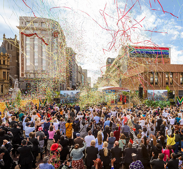 De toekomst kwam tot leven toen meneer David Miscavige, de kerkelijk leider van de Scientology religie, de enthousiaste menigte die elke centimeter van het historische plein vulde toesprak. “Wat is het een absolute eer om op deze gedenkwaardige dag bij jullie te zijn”, begon meneer Miscavige. “Want, wanneer Afrika roept, wie kan er dan ooit weerstand bieden? Vooral wanneer het je naar het huis van Nelson Mandela brengt, waar vrijheid geen slogan was, maar een zaak om voor te sterven. En net zoals hij streed voor de vrijheid van een natie, zo strijden jullie voor de vrijheid van de geest zelf”, vervolgde hij. “Want nu jullie deze Ideale Org betrekken, erven jullie een verantwoordelijkheid om te voldoen aan die altijd aanwezige roep voor vrijheid.”