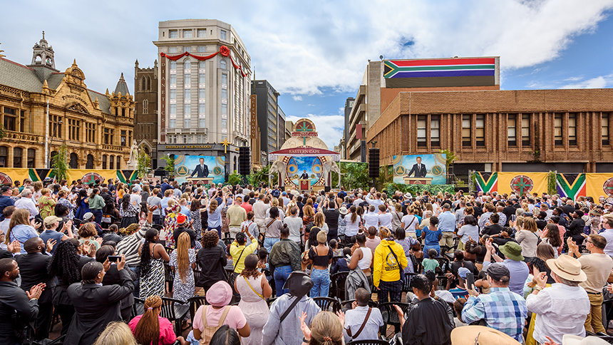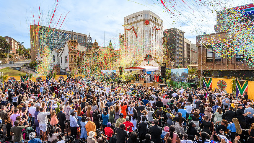 Een opgewonden menigte viert de opening van een historisch monument in Gqeberha (vroeger Port Elizabeth) dat nu is gerestaureerd en in de skyline van de Nelson Mandela Bay oprijst. Het betekent een nieuwe dageraad van spirituele vrijheid in dit Land van Legenden.