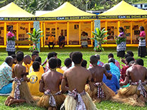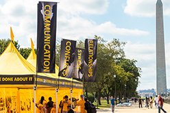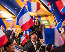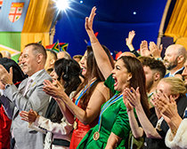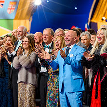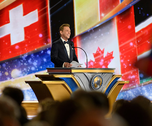 Als afsluiting van een inspirerende presentatie over de humanitaire campagnes onthult meneer Miscavige nieuwe programma’s op Scientology Network – wat een zee van zwaaiende vlaggen en gejuich in de grote feesttent ontketent.