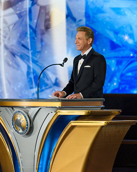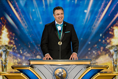 Meneer David Miscavige, kerkelijk leider van de Scientology religie, betreedt het podium in de grote feesttent voor het energieke publiek dat wacht op het begin van een onvergetelijke avond.