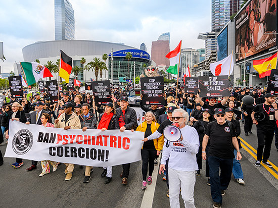 OVERAL VERONTWAARDIGING Pleitbezorgers van CCHR gingen bij elk groot psychiatrisch congres ter wereld de straat op – van Madrid tot Berlijn en Los Angeles, allemaal in naam van zorgen voor gerechtigheid op het terrein van de ggz.