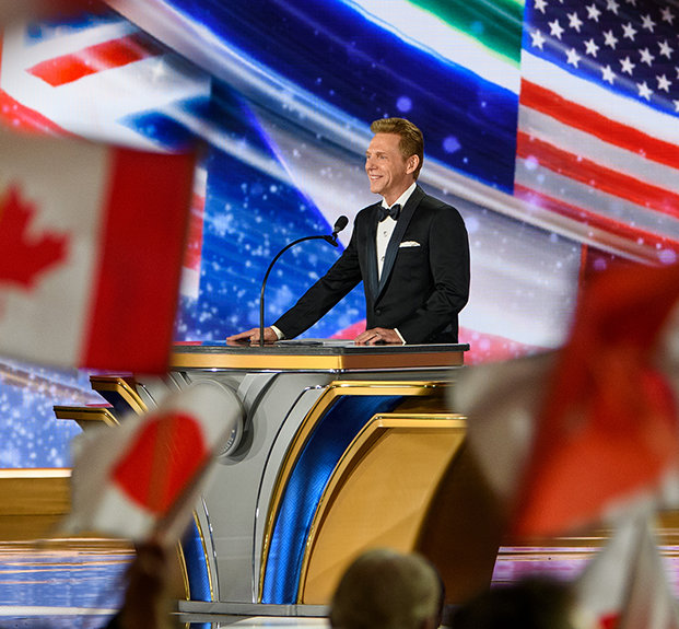 Meneer Miscavige verwelkomt Scientologists en gasten op een avond vol kleur en triomf, terwijl vlaggen wapperen, de stemming stijgt en het publiek opstaat van vreugde.