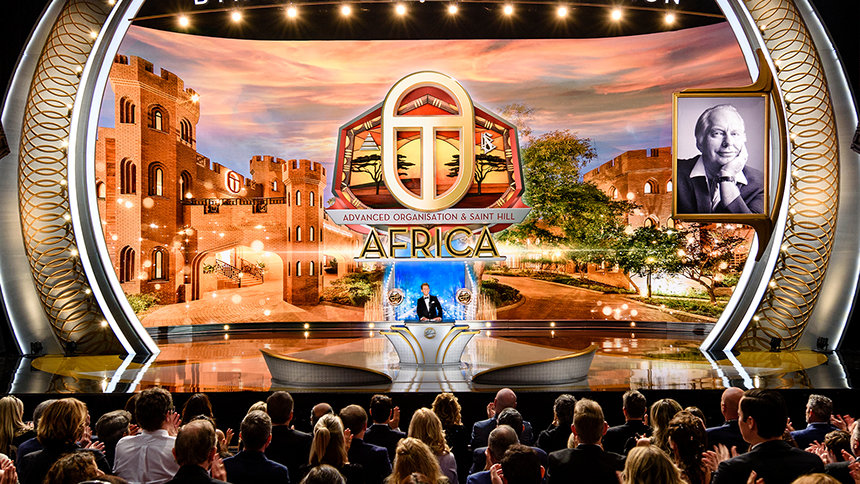 En zo presenteerde meneer Miscavige vervolgens de bekroning van de expansie van dit jaar, de opening van de eerste nieuwe Advanced Organization in meer dan 35 jaar. De historische opening van een majestueus kasteel, dat uitkijkt op 9 hectare Hoogveld, maakte de hogere spirituele niveaus van Scientology op Afrikaanse bodem voor het eerst mogelijk. En daarmee was het de verwezenlijking van een droom die meneer Hubbard meer dan 50 jaar geleden voor het eerst tot uitdrukking had gebracht. Tijdens de presentatie werd een serie epische vieringen beschreven, van de geweldige grootse opening, die nationale hoogwaardigheidsbekleders begroetten als een “ontwaken van ons geliefde Afrika”, tot een gedenkwaardige bijeenkomst van stamhoofden. Binnen enkele dagen na de opening, vond er in het kasteel een “Top van Tronen” bijeenkomst plaats van 14 monarchen van vijf Afrikaanse landen. De eregast van het evenement, koningin Shebah III, Keizerin van de Koninklijke Afrikaanse Koninkrijken, erkende L. Ron Hubbard voor het vinden van “de middelen om alle koninkrijken en volkeren van deze bakermat van Afrika te verenigen”.