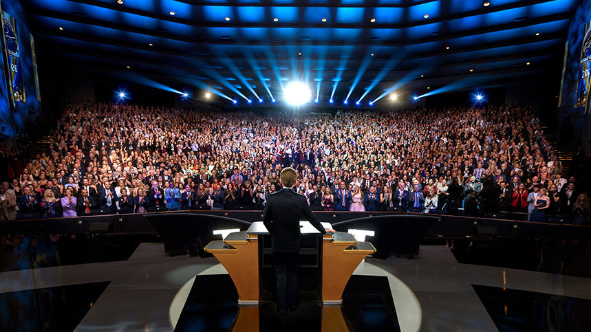 De avond begon met een daverende staande ovatie voor dhr. David Miscavige, kerkelijk leider van de Scientology religie, toen hij het podium betrad en de toon zette voor wat er nog zou komen.