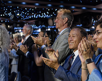 “Sinds de laatste keer dat we elkaar ontmoetten, omvat ons zonnestelsel van kerken nu ook: Boedapest in Hongarije, Harlem in New York, San Diego in Californë en aan de rand van de bewoonde wereld Auckland in Nieuw-Zeeland”, zei hij, voordat hij in detail inging op de meest recente officiële openingen van kerken in San Fernando Valley in Californië, Miami in Florida en Kopenhagen in Denemarken.