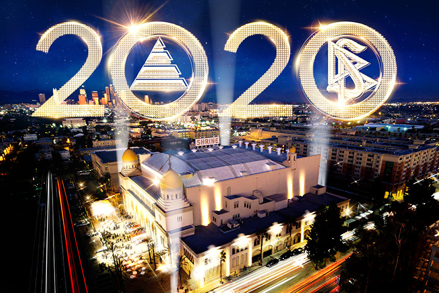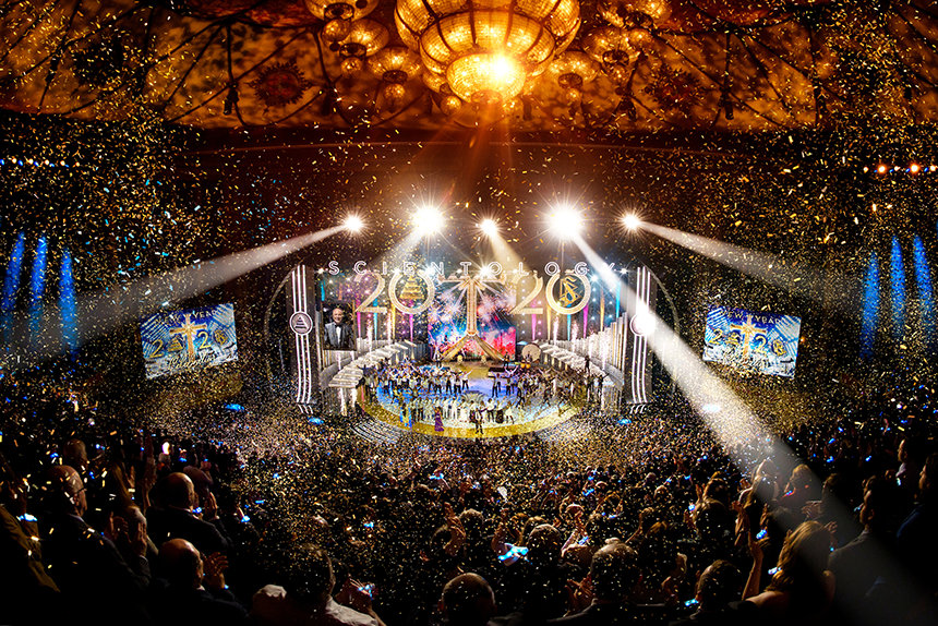 Net voorbij de helder verlichte wolkenkrabbers die het stadsgezicht van downtown LA vormen, schenen de schijnwerpers op het beroemde Shrine Auditorium, waar Scientologists bijeenkwamen om een decennium dat records brak, te vieren: