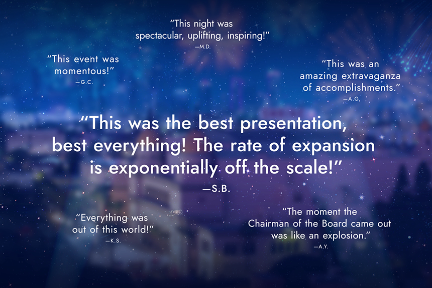 De sfeer op de avond wordt verder verhoogd wanneer meneer Miscavige een adembenemende aankondiging doet, waarmee de expansie in het nieuwe jaar wordt gelanceerd.